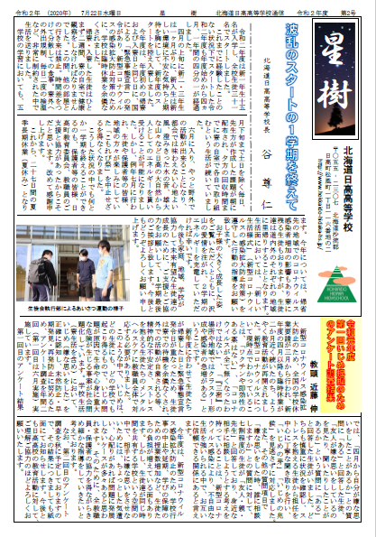 ホーム校長挨拶学校経営方針等日高高校と産業学習 入試について部活動 年間行事予定・教育課程日高での生活各種検定合格状況学校通信『星樹』学校評価等いじめ防止基本方針道徳教育全体計画進路室より 学校パンフレット問い合わせ・資料請求日高高校寮新聞等掲載・歴史ライブラリー生徒心得問題行動等に対する生徒の懲戒についての指針主権者教育日高町へのアクセスリンク